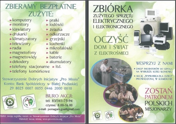 Informujemy, że można już składać zużyty sprzęt AGD, RTV na wsparcie misji. Urządzenia będą przyjmowane w godzinach pracy biura parafialnego (http://petrus.olawa.pl/index.php?m=art&id=1). Parafia nie organizuje odbioru sprzętu od darczyńcy. Zbiórka trwa do 18 lipca br. ![]() |