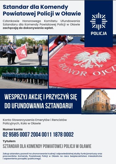 W związku z akcją społeczną na rzecz ufundowania sztandaru dla Policji oławskiej, w następnym tygodniu odbędzie się przykościelna zbiórka datków na ten cel.Serdecznie zachęcamy do materialnego wsparcia tej inicjatywy. Zgodę na przeprowadzenie zbiórki w parafiach całego dekanatu wydał Metropolita Wrocławski. |