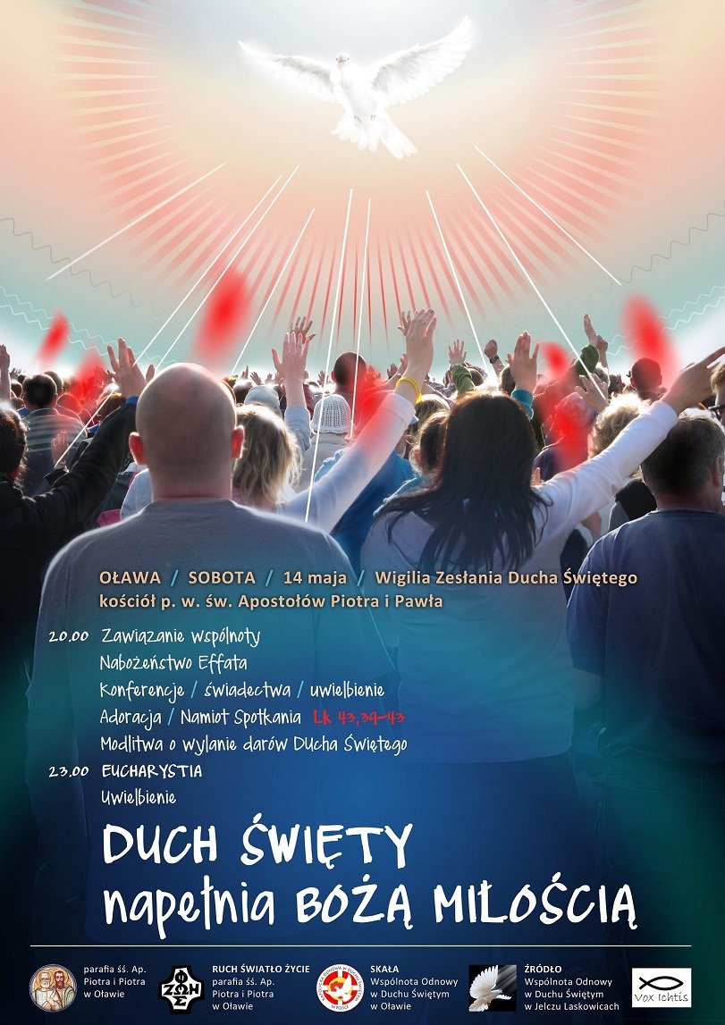 Zapraszamy do udziału w ogólnooławskiej Wigilii Zesłania Ducha Świętego, która odbędzie się w najbliższą sobotę 14 maja w naszym kościele parafialnym. Wspólną modlitwę rozpoczniemy o godzinie 20:00. W planie są następujące wydarzenia: - nabożeństwo Effatha - konferencje/świadectwa/uwielbienie - Adoracja Najświętszego Sakramentu/ Namiot Spotkania - Modlitwa o wylanie Darów Ducha Świętego - Msza Święta - godzina 23:00 |