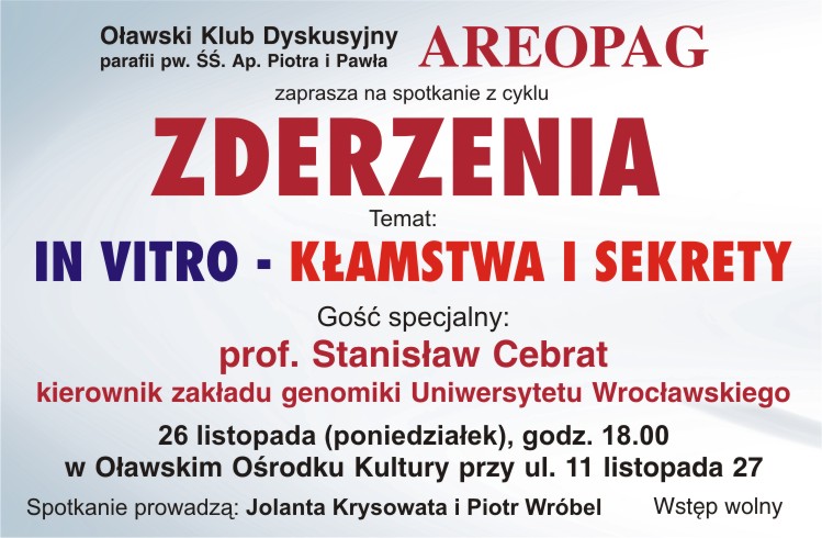 Kto chce posłuchać o rzeczach, do których raczej nie dotrze w mediach „głównego nurtu”, niech przyjmie zaproszenie Klubu Dyskusyjnego Areopag, działającego przy naszej parafii, na kolejne Zderzenia, tym razem z kontrowersyjnym tematem In Vitro. Gościem wieczoru będzie prof. Stanisław Cebrat, kierownik Zakładu Genomiki Uniwersytetu Wrocławskiego. Spotkanie odbędzie się w oławskim Ośrodku Kultury, przy ul. 11 Listopada 27, w poniedziałek, 26 listopada, o godz. 18.00.