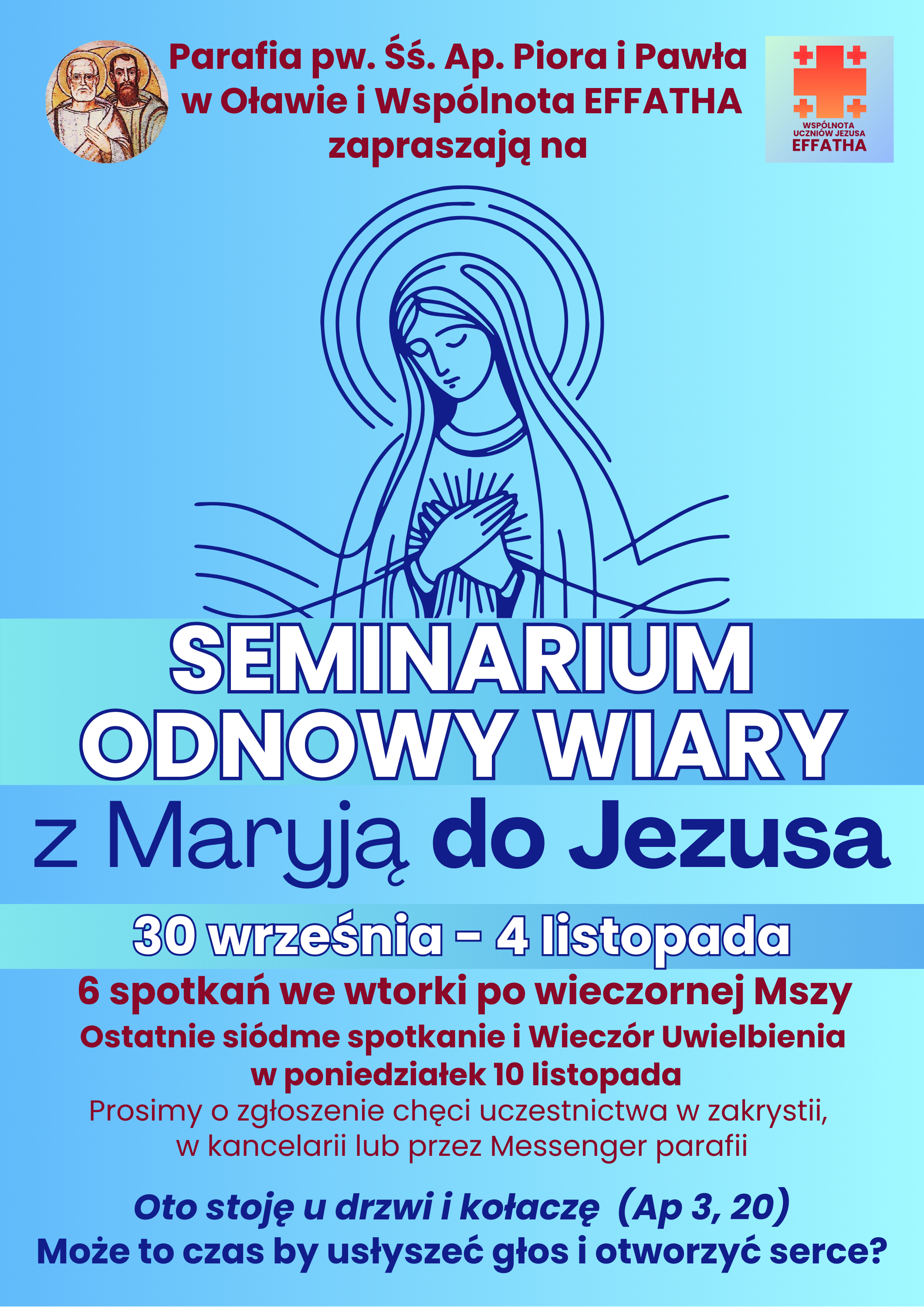 Oławskie Czuwanie w wigilię Zesłania Ducha Świętego DUCH BUDZI NADZIEJĘ Zapraszamy wszystkich mieszkańców Oławy, całego dekanatu i okolic, na wspólne czuwanie modlitewne w nocy z 7 na 8 czerwca. Chcemy wspólnie uwielbiać Boga i prosić o dary Ducha Świętego. Zapraszamy do kościoła pw. śś. Ap. Piotra i Pawła w Oławie. Rozpoczynamy uroczystą MSZĄ ŚWIĘTĄ wigilijną o godz. 18:00. Następnie udamy się do Centrum Formacji na AGAPĘ – chcemy wspólnie spędzić czas, porozmawiać, dzielić się wiarą i posilić się przed dalszą częścią wieczoru. Jeśli chcesz możesz przynieść coś od siebie, ale to nie warunek – wszyscy są mile widziani. O godz. 21:00 rozpoczniemy wspólnie WIECZÓR UWIELBIENIA, który prowadzić będą różne zespoły i wspólnoty. Więcej szczegółów wkrótce. Wspólne uwielbienie potrwa do godz. 1:00 – potem zacznie się ADORACJA W CISZY do godz. 6:00 . Zachęcamy by wcześniej zapisać się na konkretną godzinę czuwania od 1:00 do 6:00 – zapisy w parafii śś. Ap. Piotra i Pawła oraz w parafii Miłosierdzia Bożego w Oławie, a także przez link: https://docs.google.com/spreadsheets/d/1B42lSc6uy3q5HnmLjP_ZaN-pkzleQANLUTEoPh4g880/edit?usp=sharing W niedzielę o godz. 6:00 rozpocznie się wspólne dziękczynienie, akt oddania się Duchowi Świętemu, Te Deum, błogosławieństwo i zakończenie adoracji przed Mszą o godz. 7:00. Hasło naszego czuwania to „Duch budzi nadzieję”. Inspiracją była katecheza św. Jana Pawła II, którą wygłosił 11 listopada 1998r. W ramach modlitwy nowenną przed Uroczystością Zesłania Ducha Świętego zachęcamy także do lektury tej katechezy, której fragmenty będą publikowane codziennie od piątku 30 maja w mediach społecznościowych ![]() |