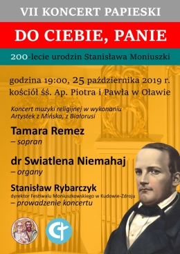Zapraszamy na VII Koncert Papieski, który odbędzie się 25 października br., o godz. 19.00. i będzie połączony z obchodami Roku Moniuszkowskiego.Koncert, na który złożą się utwory sakralne Stanisława Moniuszki, wykonają artystki z Mińska, z Białorusi: Tamara Remez (sopran) oraz dr Swiatlena Niemahaj (organy). Koncert poprowadzi dyrektor Festiwalu Moniuszkowskiego w Kudowie-Zdroju, Stanisław Rybarczyk. |