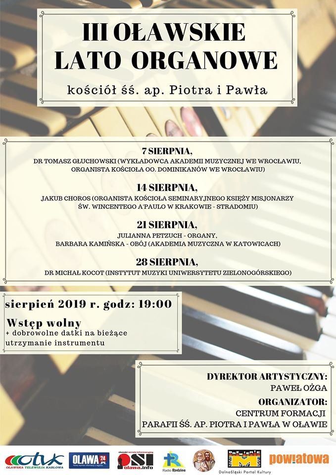 ![]() Zapraszamy na koncerty w ramach III Oławskiego Lata Organowego. Koncert inauguracyjny odbędzie się w środę, 7 sierpnia, o godz. 19.00. Zagra Tomasz Głuchowski - wykładowca Akademii Muzycznej i organista kościoła oo. Dominikanów we Wrocławiu. Repertuar koncertu będzie nawiązywał do programu jaki został wykonany na naszych organach podczas cih poświęcenia w 1926 r. Wstęp na koncerty jest wolny. Dobrowolnymi datkami można będzie wspomóc utrzymanie instrumentu. Serdecznie zapraszamy. Więcej informacji na profilu FB: |