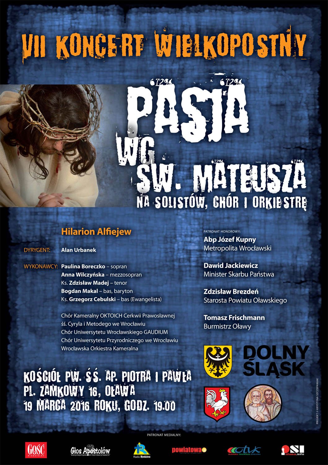 Na VII edycję Koncertów Wielkopostnych, organizowanych przez parafię pw. śś. ap. Piotra i Pawła w Oławie, zapraszamy w uroczystość św. Józefa, 19 marca, o godz. 19.00.Podczas tegorocznego koncertu, zostanie zaprezentowane dzieło prawosławnego metropolity Hiliriona Alfiejewa „Pasja wg św. Mateusza”, w wykonaniu Wrocławskiej Orkiestry Kameralnej oraz połączonych chórów: Uniwersytetu Wrocławskiego Gaudium, Uniwersytetu Przyrodniczego oraz Chóru Kameralnego Oktoich, Ordynariatu Polowego Cerkwii Prawosławnej. Całością będzie dyrygował prof. Alan Urbanek. Patronat honorowy nad koncertem objął: Abp Jóef Kupny metropolitan wrocławski, Dawid Jackiewicz minister skarbu, Zdzisław Brezdeń starosta Powiatu Oławskiego, Tomasz Frischmann burmistrz Oławy. Patronat medialny: Oławska Telewizja Kablowa, Gazeta Powiatowa Oławska, Gość Niedzielny, Radio Rodzina, Głos Apostołów. Więcej... |