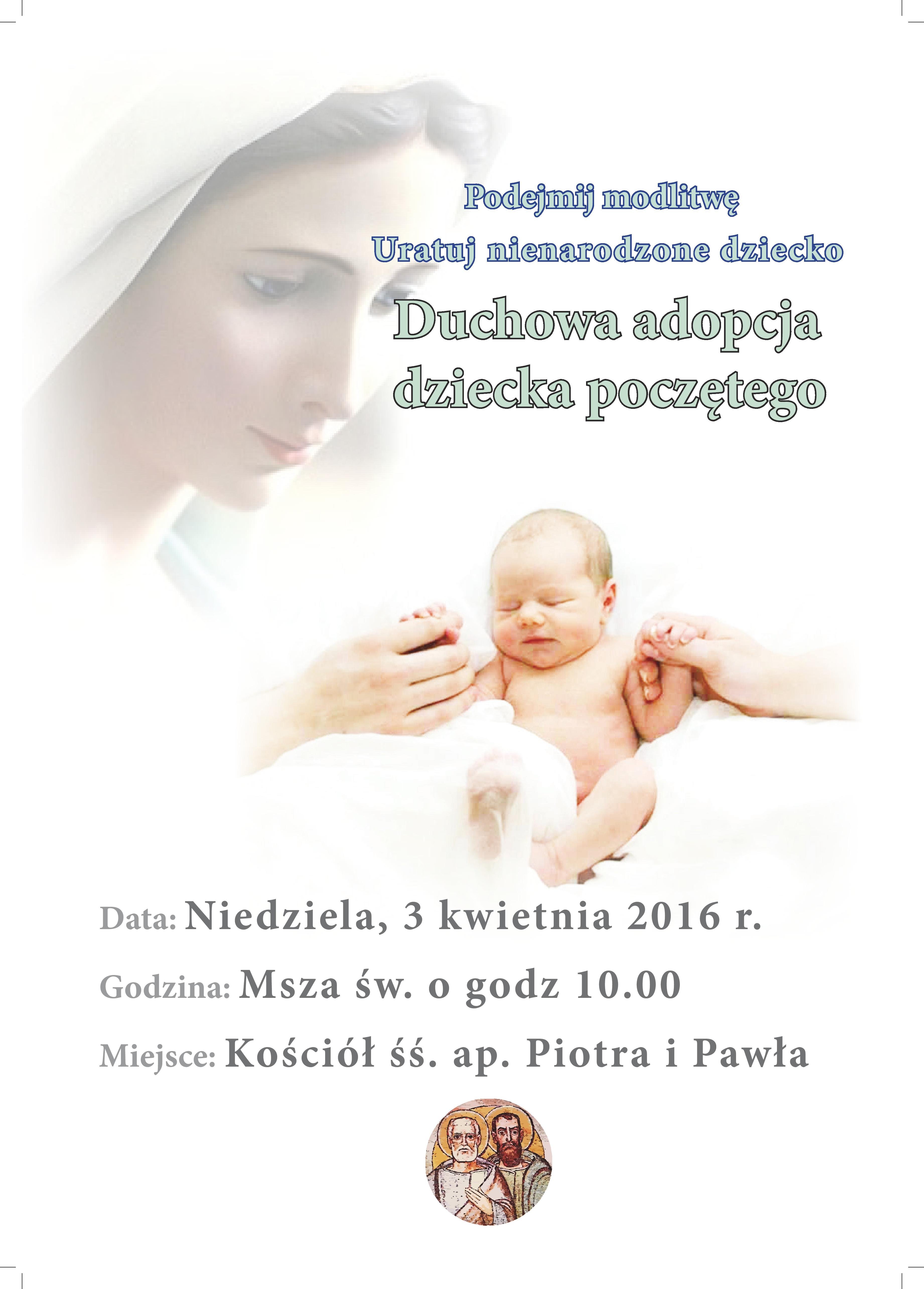 Zachęcamy do podjęcia duchowej adopcji dziecka poczętego. Duchowa adopcja jest modlitwą w intencji dziecka zagrożonego zabiciem w łonie matki. Trwa 9 miesięcy i polega na codziennym odmawianiu jednej dziesiątki różańca oraz specjalnej modlitwy w intencji dziecka i jego rodziców. Do modlitwy za poczęte dziecko można dołączyć dowolnie wybrane dodatkowe postanowienia. |