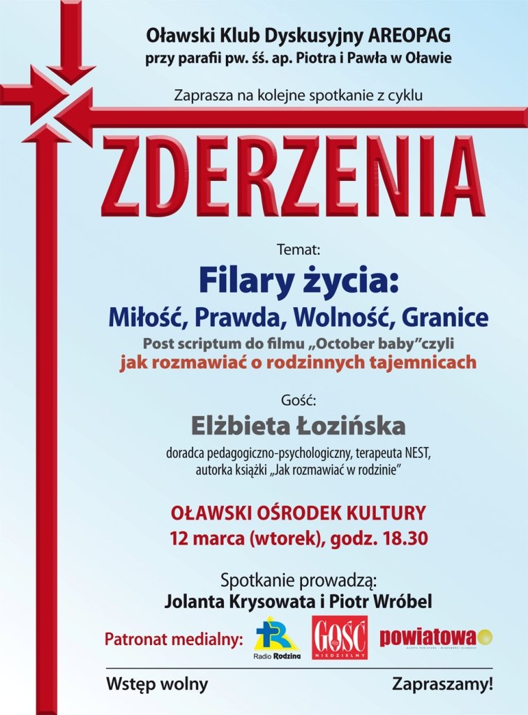 ![]() Oławski Klub Dyskusyjny Areopag zaprasza na kolejne spotkanie 12 marca (wtorek), godz. 18.30, w Oławskim Ośrodku Kultury. Temat: Filary życia: miłość, prawda, wolność, granice. Post sctiptum do filmu "October baby" . Gość spotkania: Elzbieta Łozińska - doradca pedagogiczno-psychologiczny, terapeuta NEST, autorka książki "Jak rozmawiąć w rodzinie" |