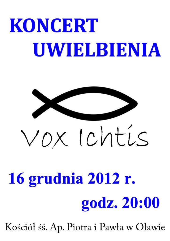 ![]() W III Niedziele Adwentu, nazywaną niedzielą radości - Gaudete - zapraszamy na kolejny już koncert uwielbienia w wykonaniu naszego młodzieżowego zespołu Vox Ichtis. Niech radość przenika nasze serca, oczekując Zabwiciela. 16 grudnia 2012 godz. 20.00 kościół śś. Ap. Piotra i Pawła w Oławie Wstęp wolny. Zapraszamy. |