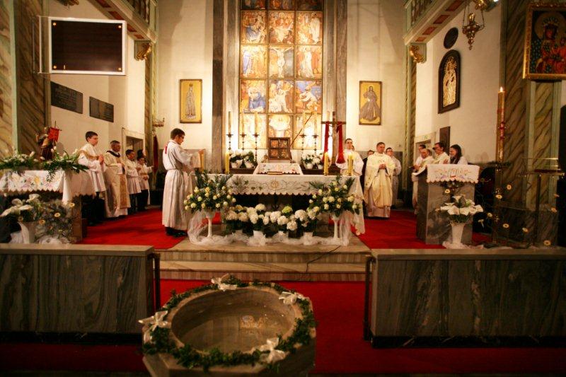 "Weselcie się już zastępy aniołów w niebie, weselcie się chóry Boga" - śpiew tych słów od ponad 1500 lat towarzyszy liturgii najważniejszych świąt dla chrześcijan - świąt Zmartwychwstania Chrystusa. W pierwszych wiekach chrześcijanie trwali na całonocnym czuwaniu, aby skoro świt razem z niewiastami udać się do pustego grobu i tam spotkać Zwycięzcę śmierci. Wszystkie kościoły powinny zadbać o uroczysty przebieg liturgii Wigilii Paschalnej. Zapraszamy do obejrzenia zdjęć z liturgii sprawowanej w naszej parafii (autor: A. Wawer). |