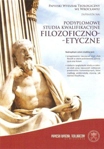 Papieski Wydział Teologiczny we Wrocławiu organizuje Podyplomowe Studia Filozoficzno-Etyczne dla absolwentów szkół wyższych. Nadrzędnym celem studiów jest przygotowanie nauczycieli etyki i/lub filozofii w szkole podstawowej, gimnazjum oraz liceum a także zdobycie i pogłębienie wiedzy w zakresie etyki przez nauczycieli (zwłaszcza) przedmiotów humanistycznych, które implikują problematykę etyczną jak również filozoficzną. |